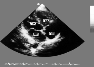 верхушка): видны полости обоих желудочков и левого предсердия, просвет