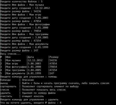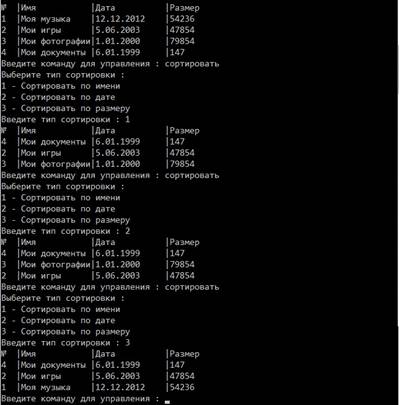 либо по размеру. После того как пользователь ввел необходимую команду программа