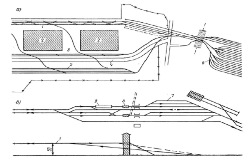 накопительные пути причала; 7 - причальные железнодорожные пути