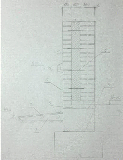 железобетонная перемычка; 5 -цементно-песчаный раствор; 6 - кирпич (внутренний