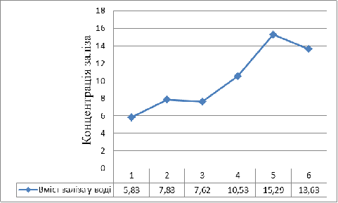 Визначено, за максимальне значення заліза спостерігається в п’ятій пробі, а