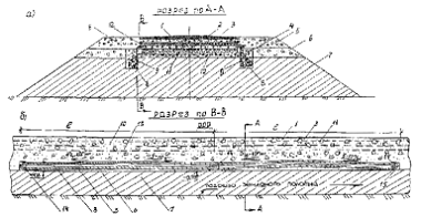 горизонтальный дренаж:а - поперечный разрез земляного полотна; б - продольный