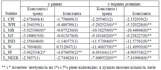 Результати перевірки рядів на стаціонарність за допомогою розширеного