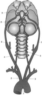 7 - хребтові артерії; 8 - основна артерія; 9 - верхня мозочкова артерія; 10 -