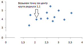 круга радиуса 1,1 для выбора первого кластера.