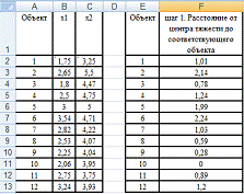 И теперь посчитаем значения расстояний объектов от нового центра тяжести