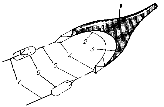 Общий вид рыболовного трала:1 - сетный мешок трала; 2 и 3 - верхняя и