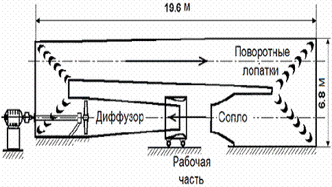трубы 19,5 м; высота 6,85м. Диффузор круглого сечения длинной 4,45 м с углом