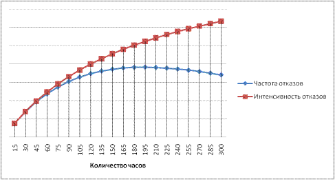 Рис. 3. Зависимость частоты и интенсивности отказов в функции