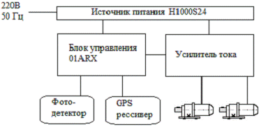 блоком управления на электродвигатели. Источником питания служит блок H1000S24. Источник питания, блок управления, усилитель тока, и GPS ресивер монтируются в электрический