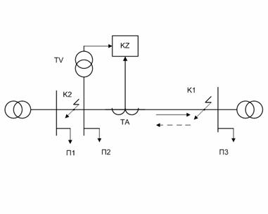 любой точке области K1. Если же КЗ произойдет на участке П1-П2, например, в
