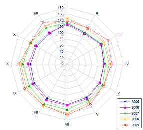 Рисунок 1 - Число умерших, по месяцам 2005-2009