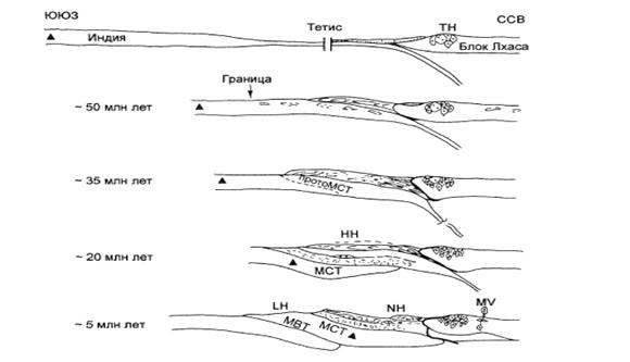 Рис. 3.3. Схема эволюции Гималаев от мезозоя до
