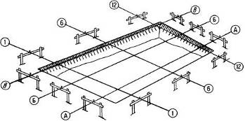 Створная обноска для закрепления осей здания в местах,