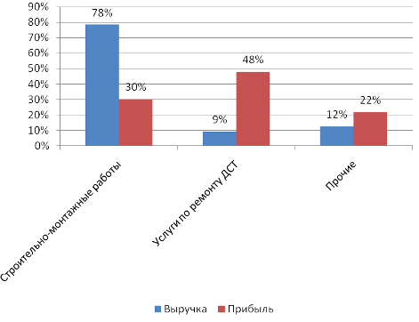 Рисунок 2 - Доля выручки и прибыли по видам деятельности в 2009 г.