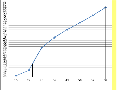 виде кумуляты. Рассчитанное значение медианы равно 23,75. Это значение