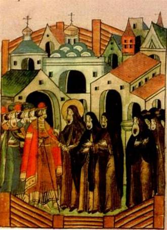 сопровождении Владимира отправляется за помощью в Киев. Там на панихиде по