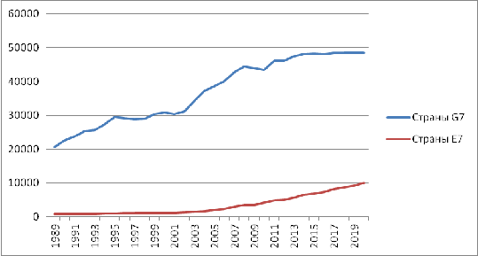 ВВП (долл. США) для стран G7 в целом снижалось, а для стран Е7 - росло. Значения
