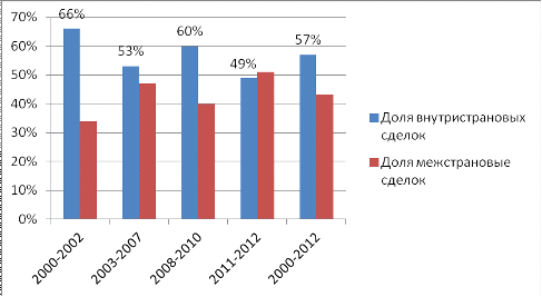 доли межстрановых сделок в 2008-2009 гг., по сравнению с долей внутристрановых