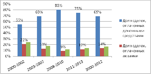 30%, по сравнению с ценой акций до объявления о сделке. (Martynova and Renneboog, 2006). Так,