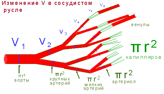 частицей крови в единицу времени - V, зависит от ширины сосудистого русла,