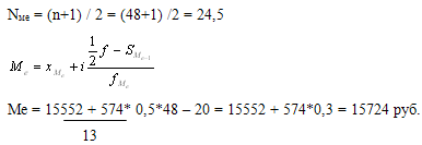 моду и медиану, мы получили, что Мо = 14689,7 руб., а Ме= 15522 руб. Таким