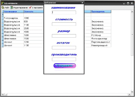 Рисунок 3. Главное меню БД «Стройматериалов»