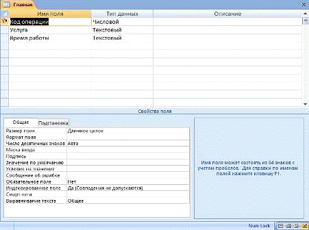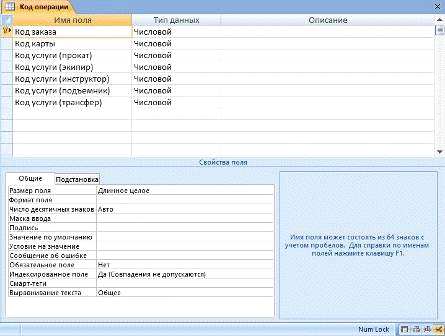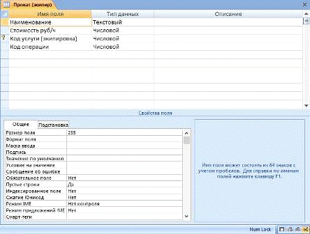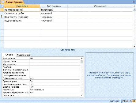 поля как: Наименование; Стоимость руб/ч.; Код услуги (прокат); Код операции.