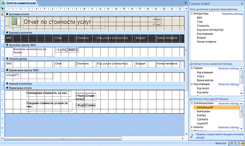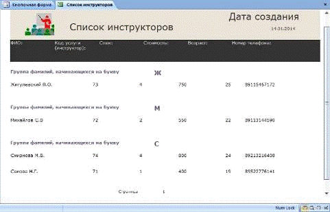 как: ФИО; Стаж; Стоимость; Код услуги (инструктор); Код операции; Возраст.