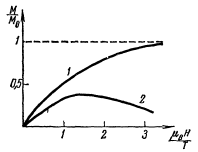 сильных полях (кривая 1 рис. 2) (M→M0 при H→∞),