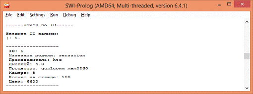 read(ID),nl,('------------------'),(ID,MODEL_NAME,MANUFACTURER,DISPLAY,PROCESSOR,CAMERA,KOLVO,PRICE),,write('