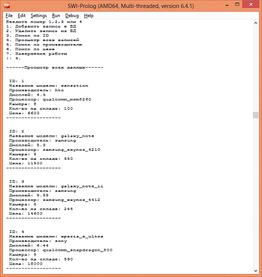 read(MANUFACTURER),nl,('------------------'),(ID,MODEL_NAME,MANUFACTURER,DISPLAY,PROCESSOR,CAMERA,KOLVO,PRICE),,write('
