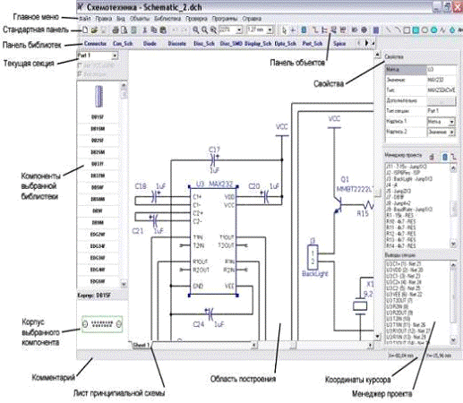області побудови принципової схеми, головного меню, панелей інструментів, рядка