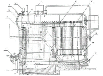 9 - кипятильные трубы, 10 - обдувочное устройство, 11 - нижний барабан, 12 -