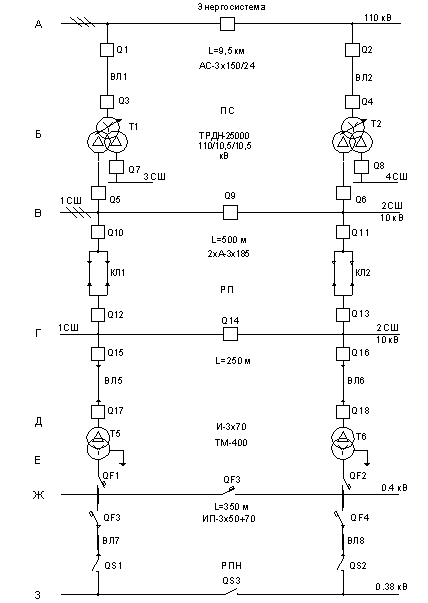 трансформаторами Т1, Т2 напряжением 110/10 кВ;