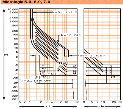 .2 Защитные время-токовые характеристики электронных расцепителей Micrologic 5.0 A и STR22SE, установленные соответственно в выключателях QF1, QF2, QF и QF4:
