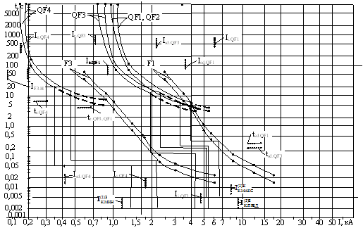. Защитные время-токовые характеристики расцепителей выключателей QF1, QF3 и QF4 построены по точкам, координаты которых