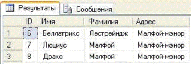 SELECT A.ID, A. [Имя], A. Фамилия, A. Адрес FROM dbo. Клиенты AS A A. Адрес LIKE ‘%Малфой’ // здесь могла