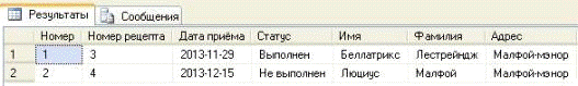 SELECT A. Номер, A. [Номер рецепта], A. [Дата приёма], A. Статус, B. Имя, B. Фамилия, B. Адрес
