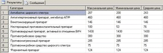 SELECT A. Категория, MAX (A. Стоимость) AS [Максимальная цена], MIN (A. Стоимость) AS [Минимальная цена], AVG (A. Стоимость) AS [Средняя цена]