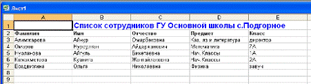 Sheet.Cells[1,2]:='Список сотрудников ГУ Основной школы