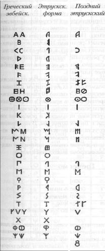 с буквами этрусского алфавита. В наши дни она не имеет приверженцев, так как