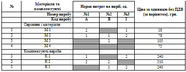 виробництва виробів, а також ціна цих ресурсів задані у вихідних даних -