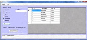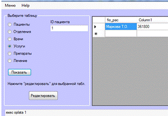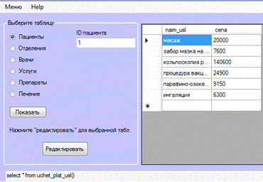 информации из БДquery = string.Empty;= "select * from uchet_plat_usl()