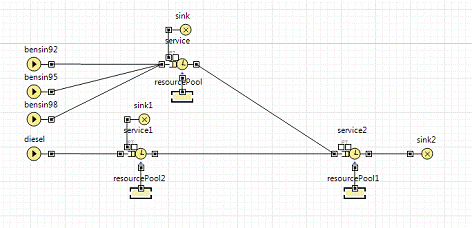 Заявки классов бензин А92, А95, А98 обслуживаются в многоканальном устройстве PribBensin. Заявки класса дизель