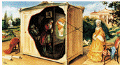 в оконной ставне изображает то, что находится за окном, только в перевернутом