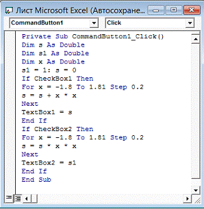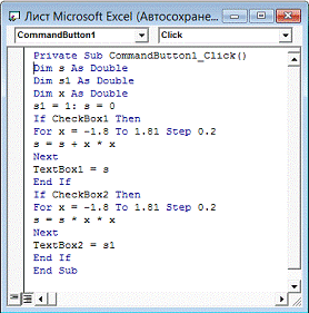 s + x * x= sIfCheckBox2 Thenx = -1.8 To 1.81 Step 0.2= s * x * x= s1IfSub