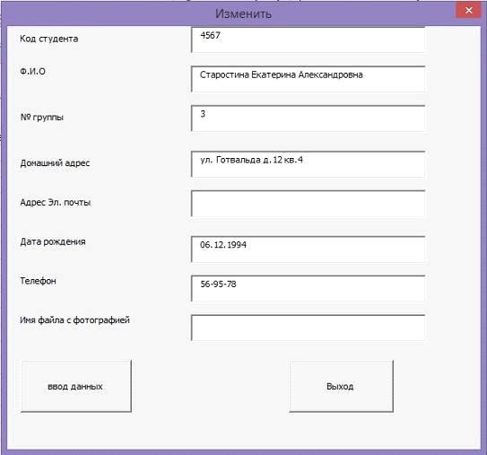 введено код студента, Ф.И.О, № группы, домашний адрес, дата рождения, телефон и