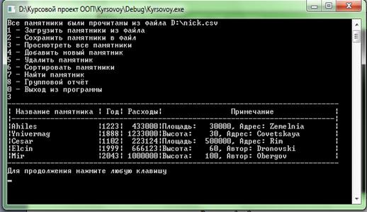 Vinchi");.Add_Pamiatnik(z1);.Add_Pamiatnik(k1);.Add_Pamiatnik(s1);.Add_Pamiatnik(sk1);*/.LoadFile("D:\\nick.csv");menu;=9;