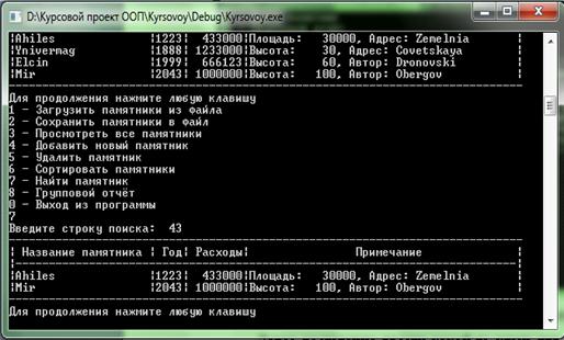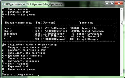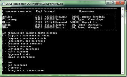 памятника: ");(stdin);(name);.Del_Pamiatnik(name);("Для продолжения